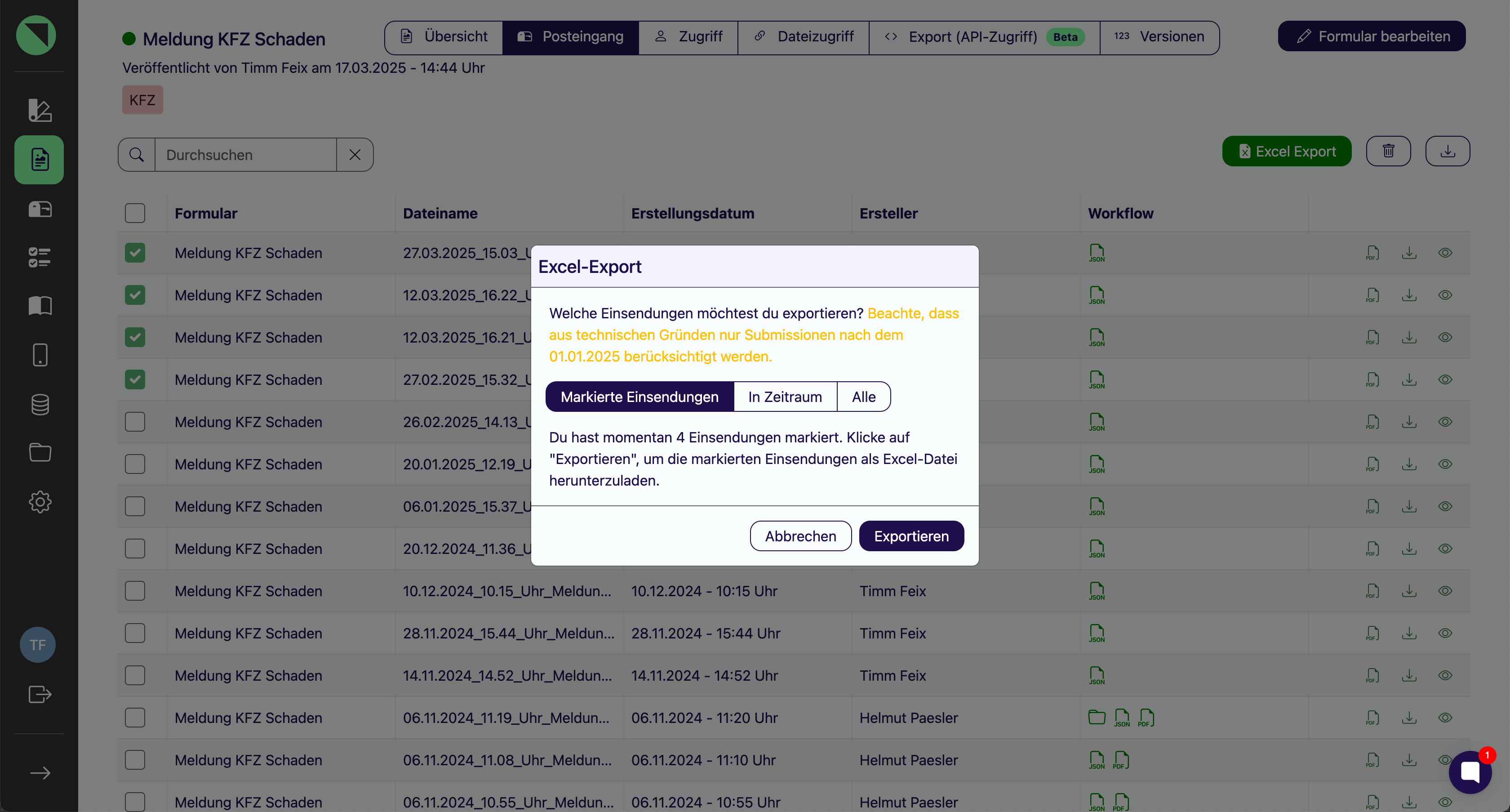 Excel-Export von Datensätzen (Expert-Plan)Über den Posteingang auf der Detailseite zu jedem deiner Formulare hast Du jetzt die Möglichkeit, eine oder mehrere abgesendete Formulare als Excel-Datei zu exportieren. Für jeden Datenpunkt in dem entsprechenden Datensatz wird eine Spalte in der Excel-Datei erzeugt.