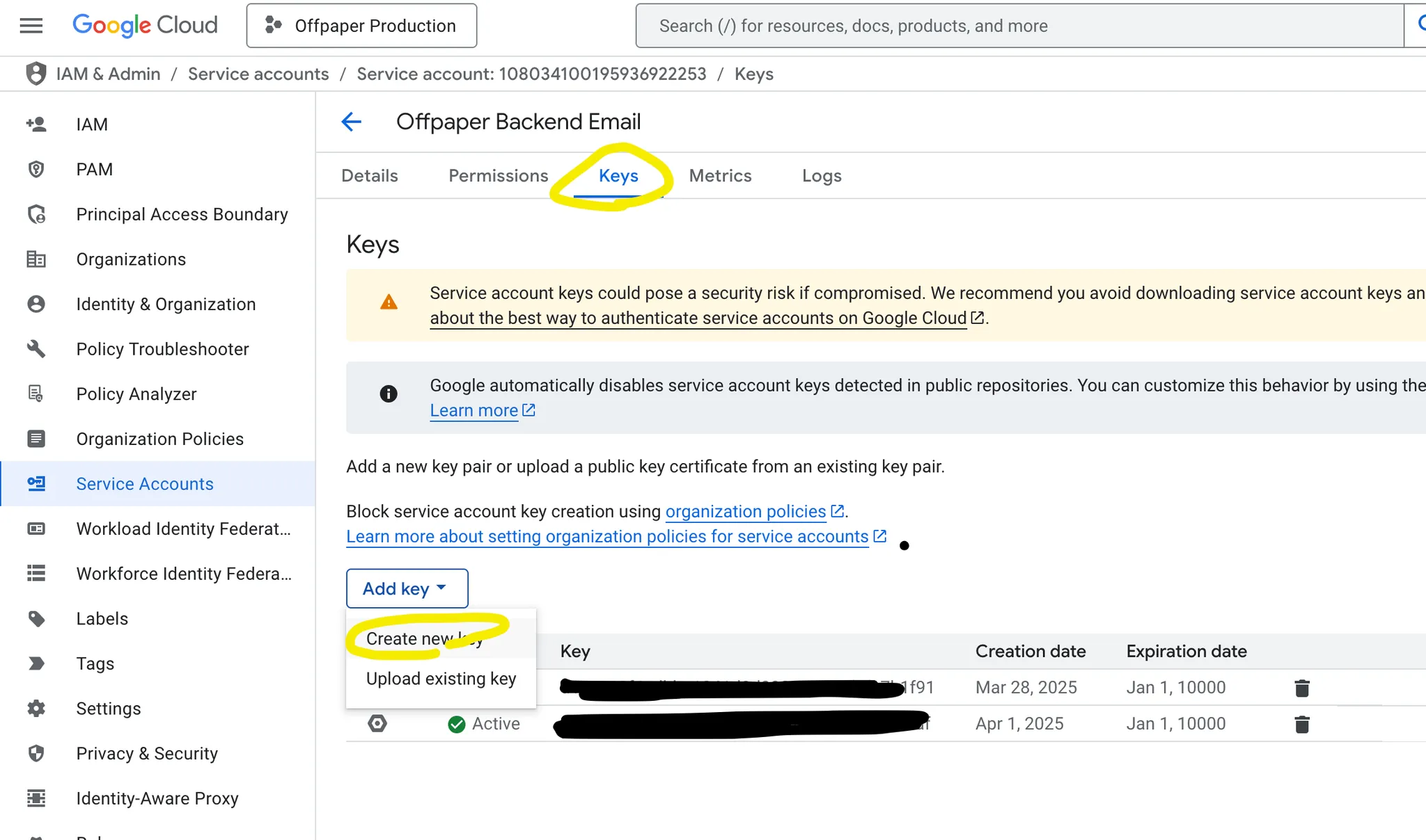 Erstelle einen geheimen SchlĂŒsselKlicke auf das neu erstellte Dienstkonto (Service Account), danach im MenĂŒ auf âSchlĂŒsselâ (Keys), auf âSchlĂŒssel hinzufĂŒgenâ (Add Key) und âErstelle neuen SchlĂŒsselâ (Create new key).: