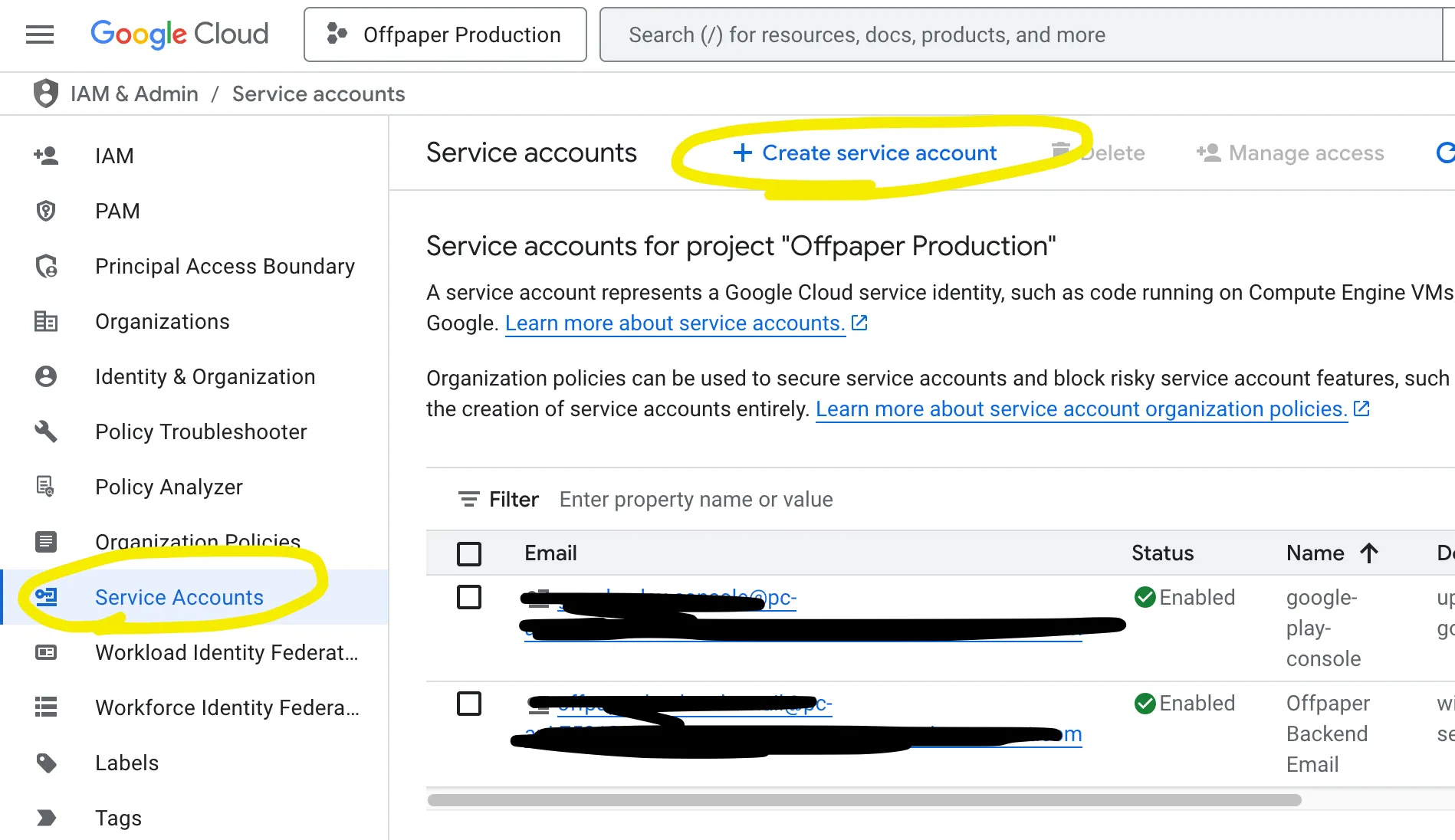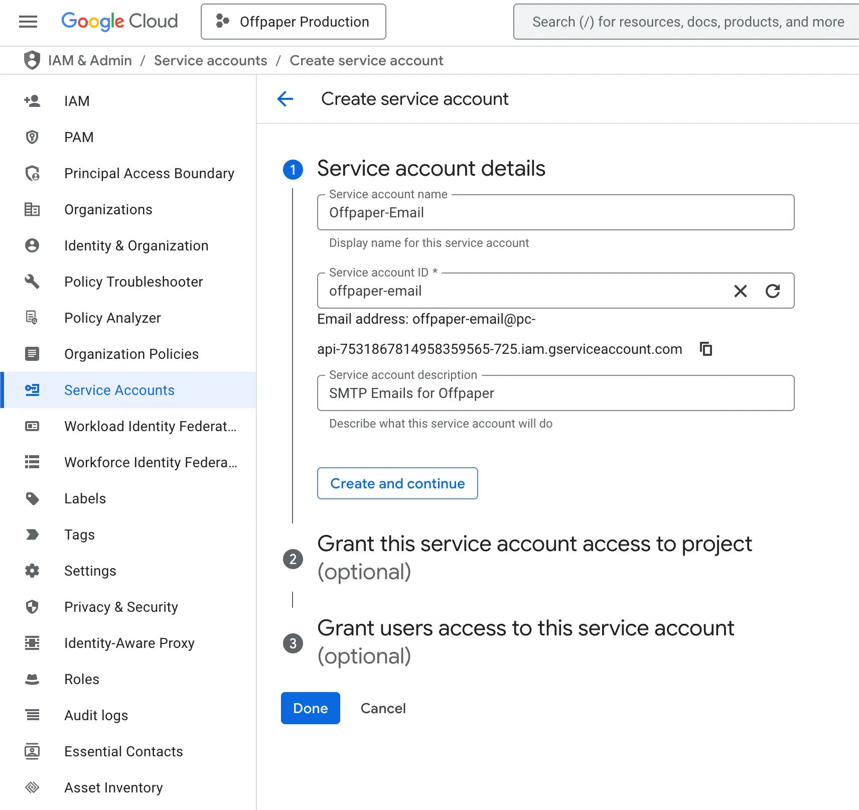 WĂ€hle âOffpaper-Emailâ als Namen und klicke anschlieĂend auf âFertigâ (Done), um das Dienstkonto zu erstellen:
