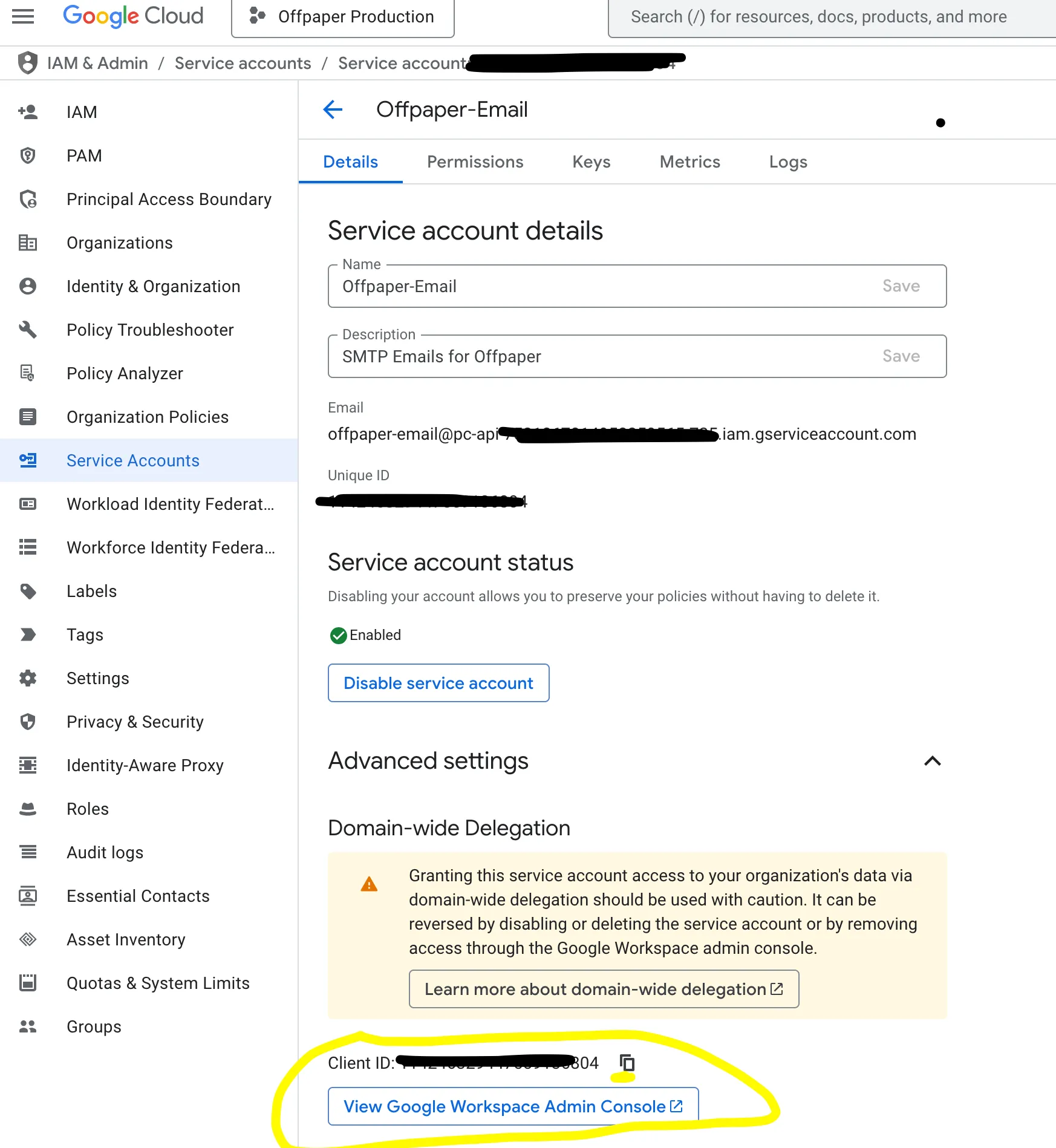VorgehensweiseOffpaper kann ĂŒber ein Dienstkonto (âService Accountâ) in der Google Cloud auf Google Workspace zugreifen, um E-Mails zu versenden. Zuerst muss daher ein Dienstkonto in der Google Cloud angelegt werden. Im Dienstkonto wird ein geheimer SchlĂŒssel fĂŒr Offpaper erstellt. Dann wird dem Dienstkonto bei Google Workspace erlaubt, E-Mails fĂŒr Google Workspace zu versenden. Wenn bei Google alles richtig eingerichtet ist, kann der geheime SchlĂŒssel bei Offpaper eingegeben werden. Wenn alles funktioniert, werden E-Mails von Offpaper ab diesem Zeitpunkt von einer E-Mail-Adresse deiner eigenen Firma versendet, z.B. noreply@deinefirma.de. Diese muss dazu nicht als eigenes Postfach existieren.