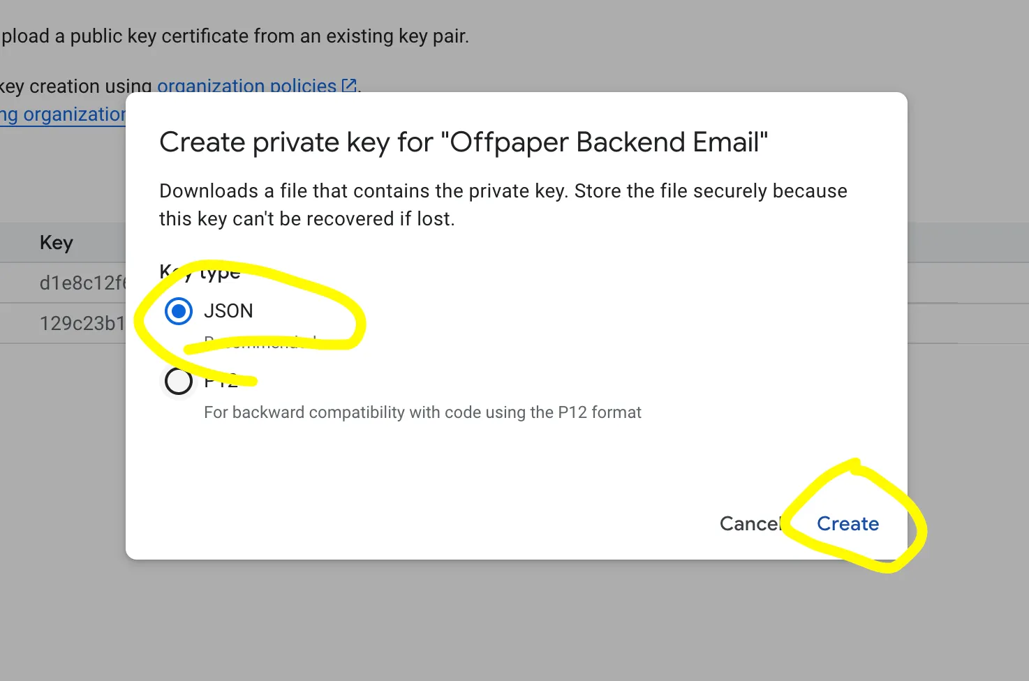 Erstelle einen neuen geheimen SchlĂŒssel im Format JavaScript Object Notation (JSON-Key) und klicke auf âErstellenâ (Create). Speichere die Datei: