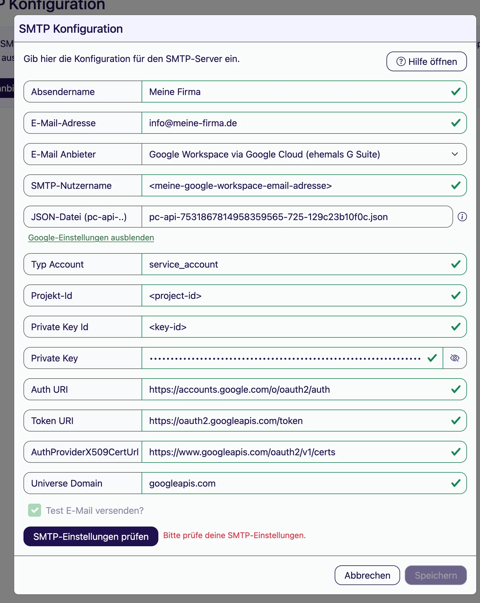 Sobald Du die Datei eingefĂŒgt hast, werden die ausgeblendeten Spalten befĂŒllt. Teste deine Konfiguration und stelle sicher, dass alles funktioniert (âSMTP-Einstellungen prĂŒfenâ).