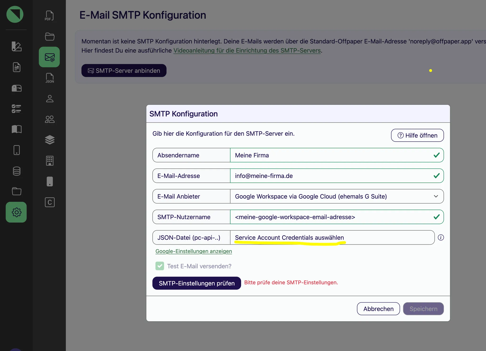 Gib die Zugangsdaten in Offpaper einGehe in Offpaper in den Einstellungen auf âSMTP-Konfigurationâ und klicke auf âSMTP-Server anbindenâ: