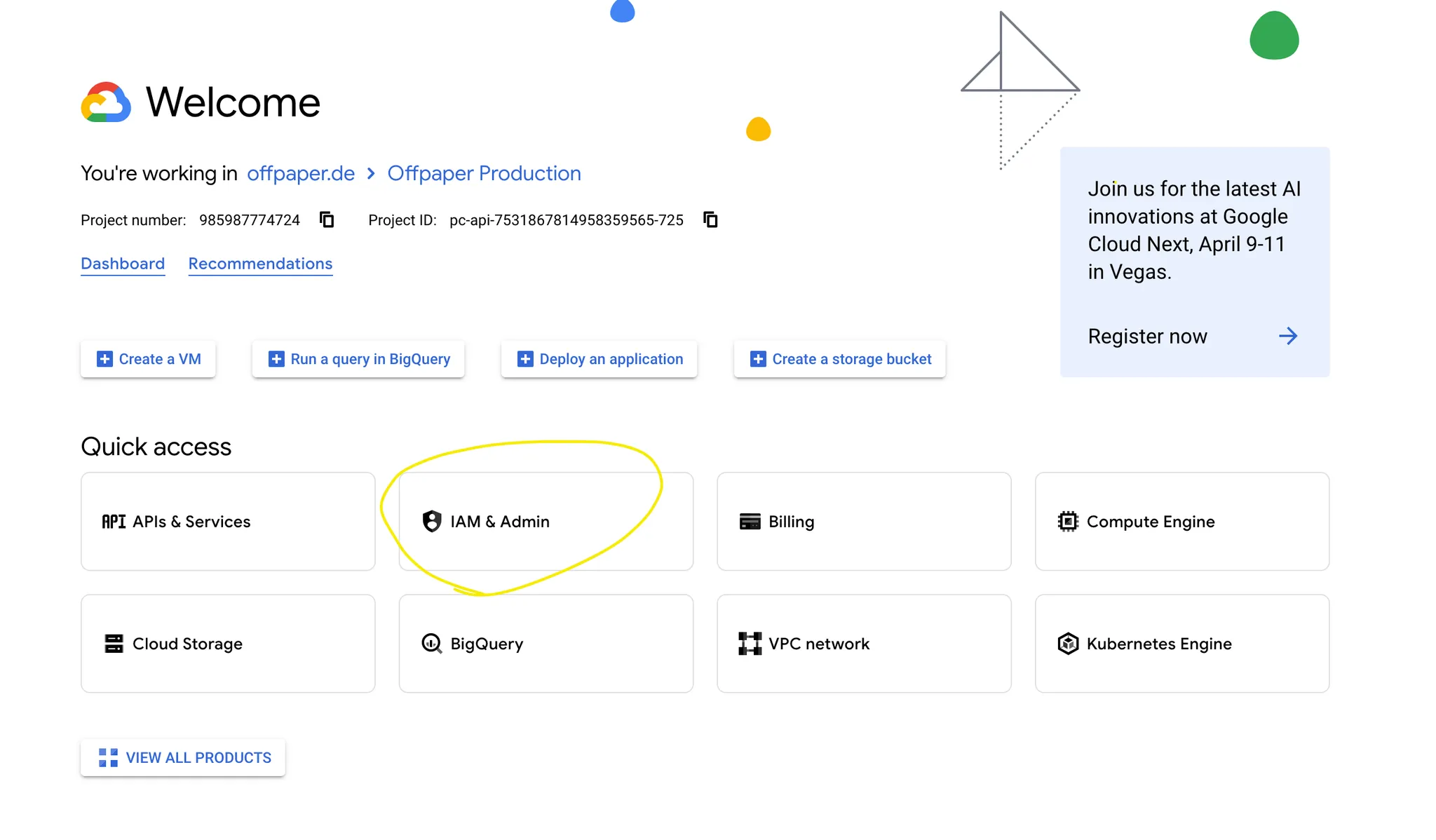 Melde dich bei Google Cloud an oder erstelle ein Google Cloud-KontoMelde dich zunĂ€chst bei Google Cloud an. Falls Du kein Google Cloud-Konto hast, kannst Du hier ein Google Cloud-Konto erstellen. Klicke dann auf âIAM & Verwaltungâ (IAM & ADMIN):
