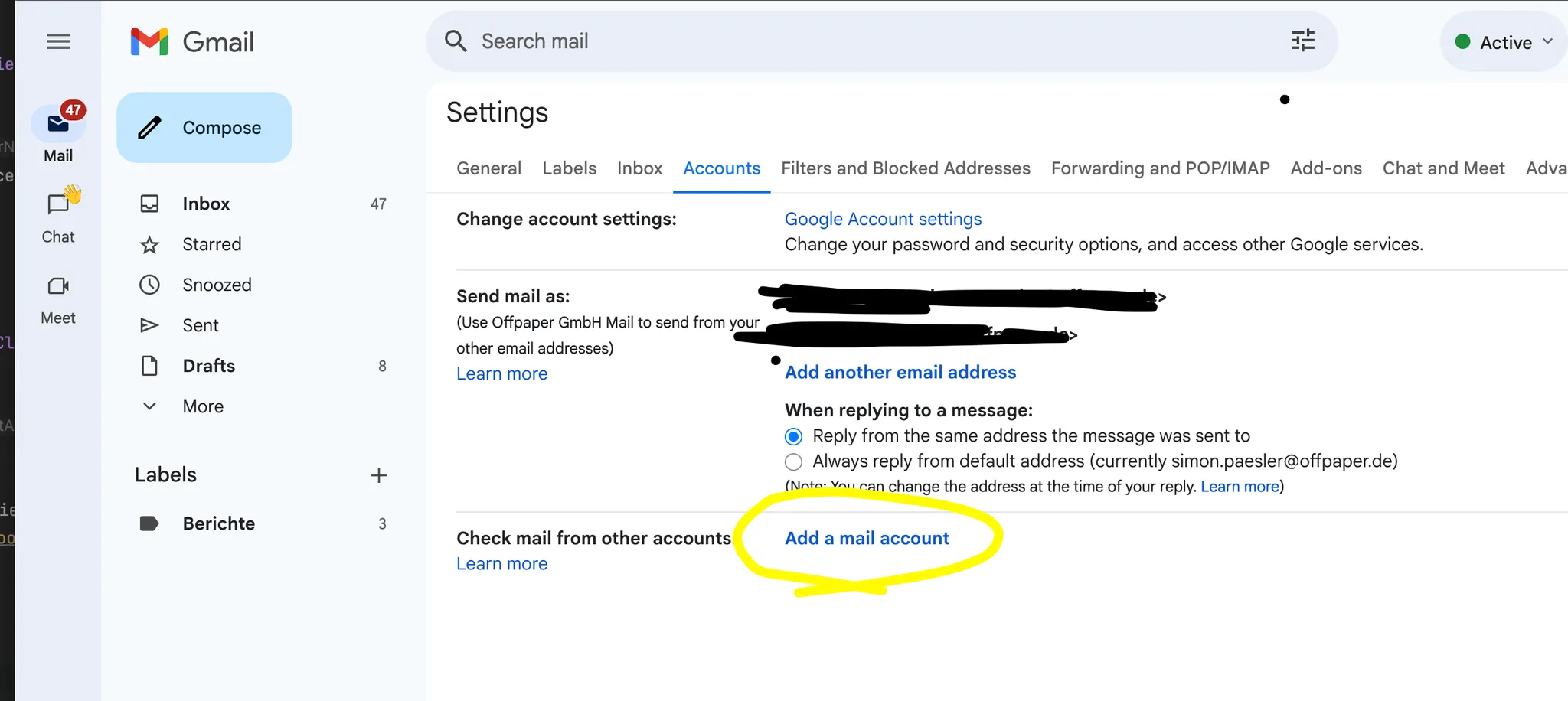 ( Optional) E-Mail-Alias verwendenWenn du als Absende E-Mail Adresse nicht deine persönliche Adresse verwendest, sondern eine Alias-Adresse ohne eigenen Benutzer, bswp. info@meine-firma.de, stelle sicher dass dein Google-Benutzer berechtigt ist, E-Mails unter dieser Adresse zu senden. Ist dies nĂ€mlich nicht der Fall, verwendet Google automatisch deine persönliche E-Mail Adresse. Um eine neue Absende-Adresse hinzuzufĂŒgen, fĂŒge sie in den Einstellungen deines GMail-Kontos als neues Mail-Konto hinzu.