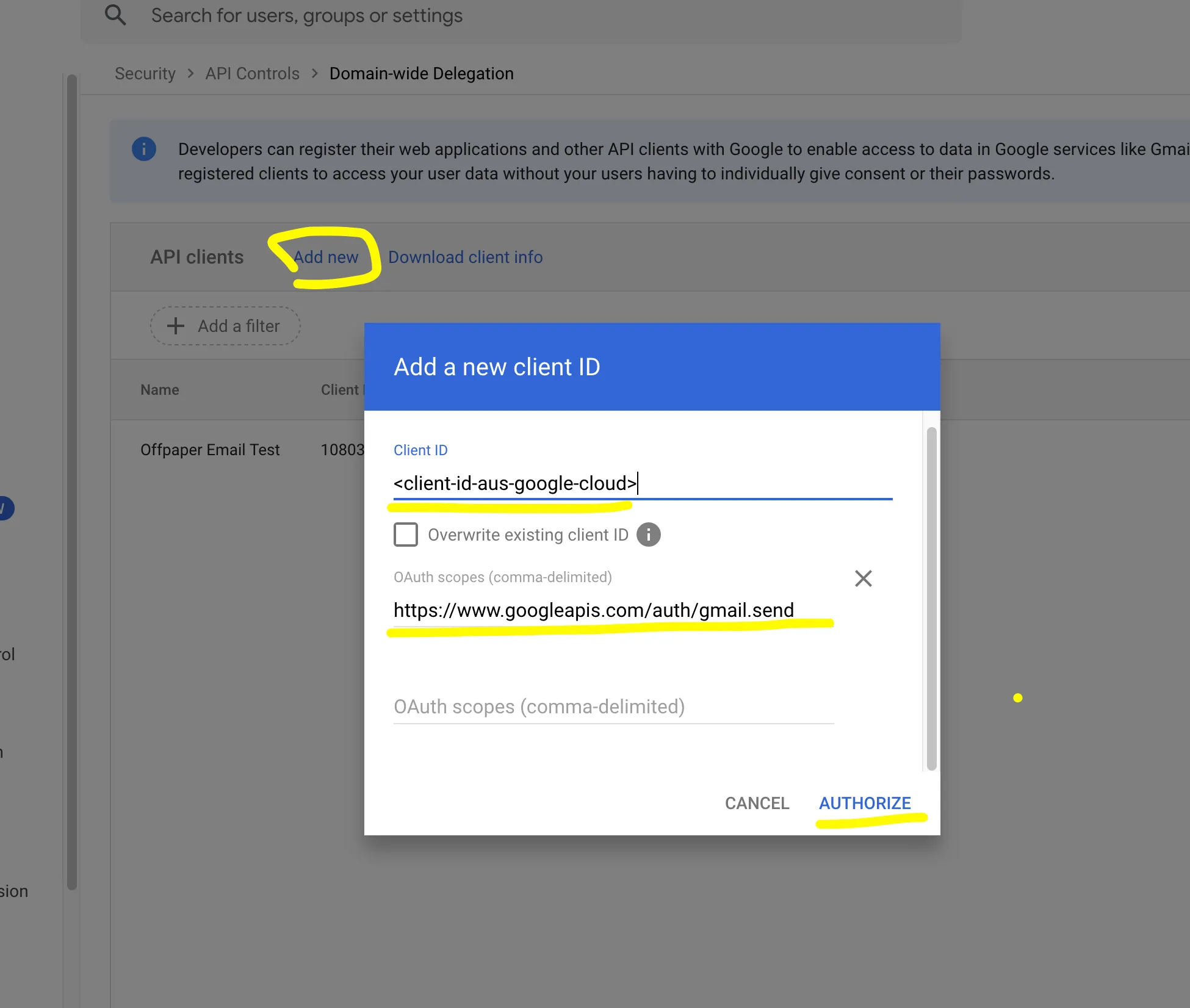 Klicke auf âNeu hinzufĂŒgenâ (Add new), fĂŒge bei Client-ID die vorhin in der Google Cloud kopierte âClient IDâ ein und bei âOAuth Bereicheâ (Scopes) "https://www.googleapis.com/auth/gmail.sendâ . Klicke anschlieĂend auf âAutorisierenâ (Authorize).