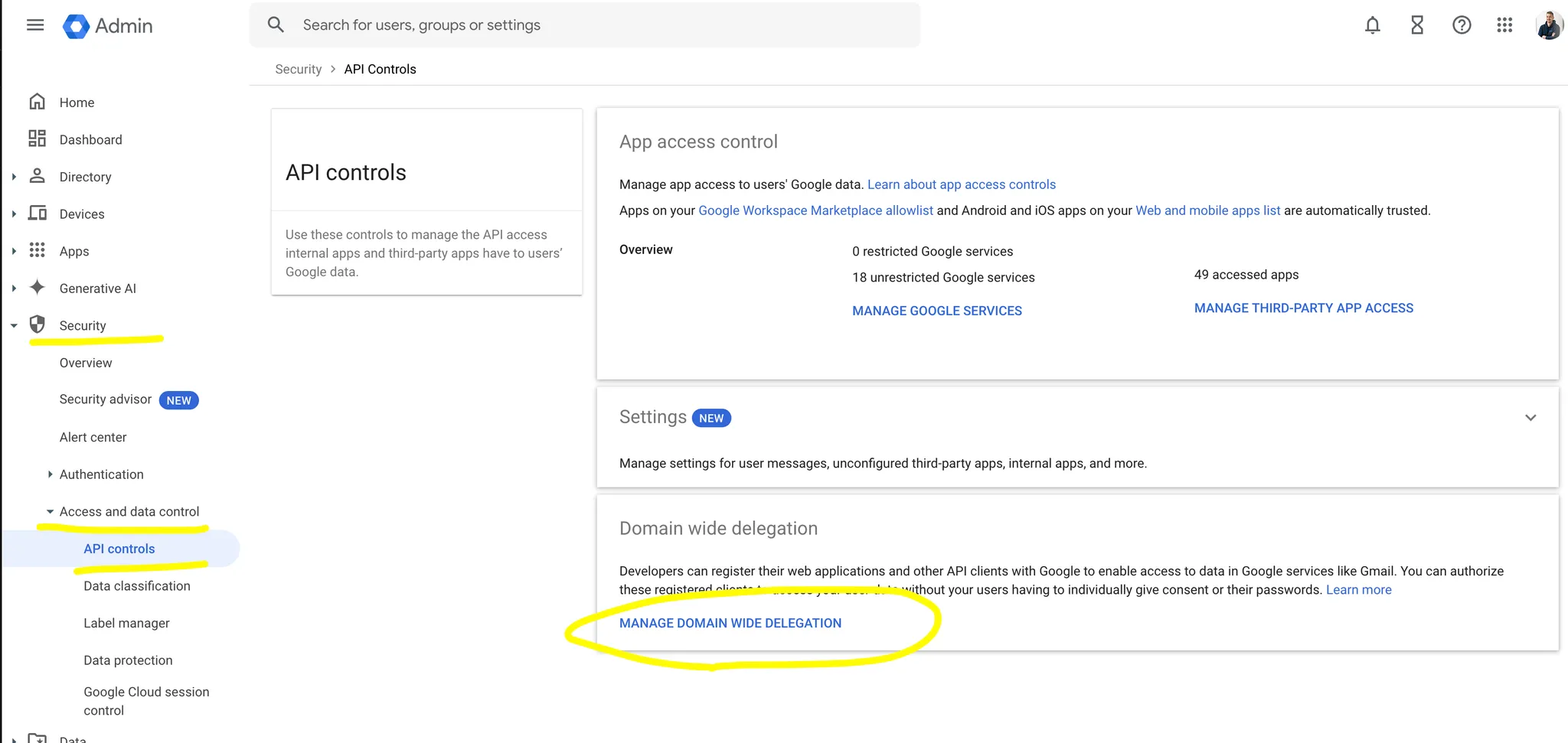 Klicke auf âSicherheitâ (Security), âZugriffs- und Datenkontrolleâ (Access and data control), âAPI Steuerungâ (API controls) und anschlieĂend auf âDomainweite Delegierung verwaltenâ (Manage Domain Wide Delegation).