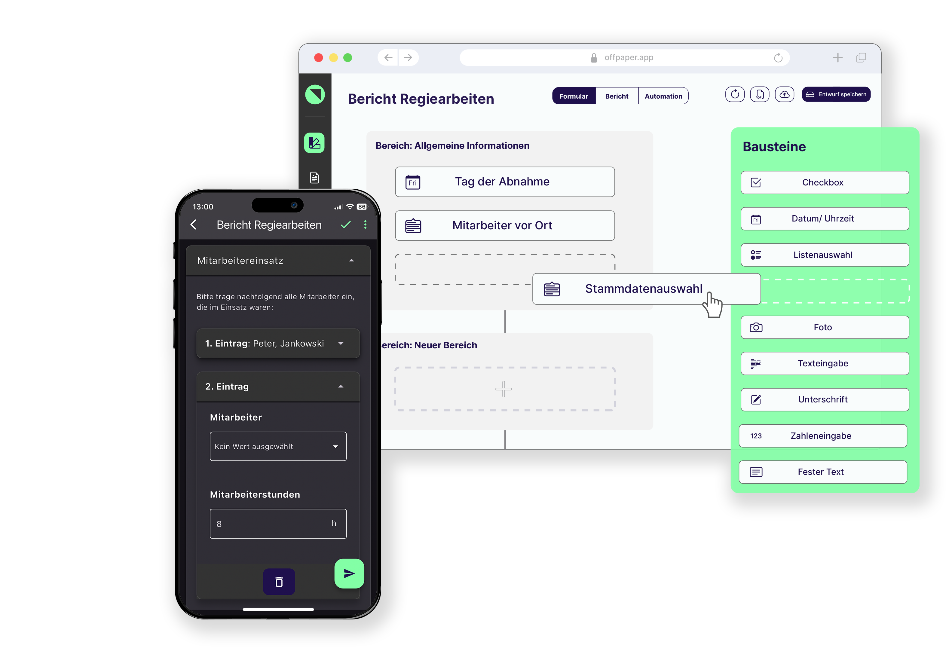 Offpaper ist ein App-Baukasten für digitale Formulare und Checklisten, die auf mobilen Geräten wie Smartphones und Tablets von Mitarbeitenden deines Unternehmens ausgefüllt werden. Offpaper ermöglicht die automatische Weiterverarbeitung der erfassten Daten, etwa durch PDF-Erstellung, E-Mail-Versand oder Cloud-Ablage – ideal zur Digitalisierung bisher papierbasierter Prozesse.