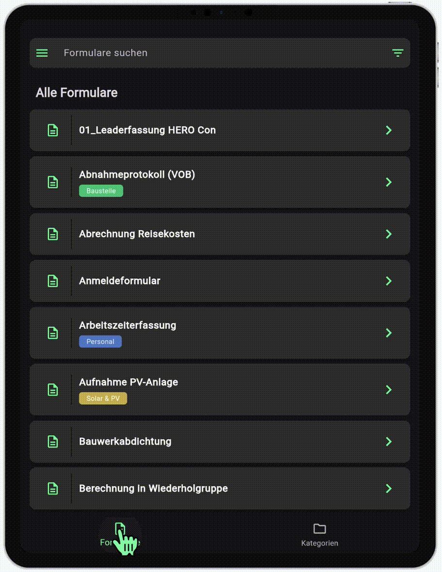 Wenn Du die Offpaper App öffnest, siehst Du alle Formular-Apps die dir über die Nutzergruppen zugeordnet sind. Die Formular-Apps sind alphabetisch geordnet und können durchsucht werden. Ganz oben sind die Formulare, die Du zuletzt verwendest hast. Alternativ kannst Du auch über den Reiter “Kategorien” auf die Formulare zugreifen. Das Symbol links oben öffnet das App-Menü um auf weitere Bereiche der App zuzugreifen.