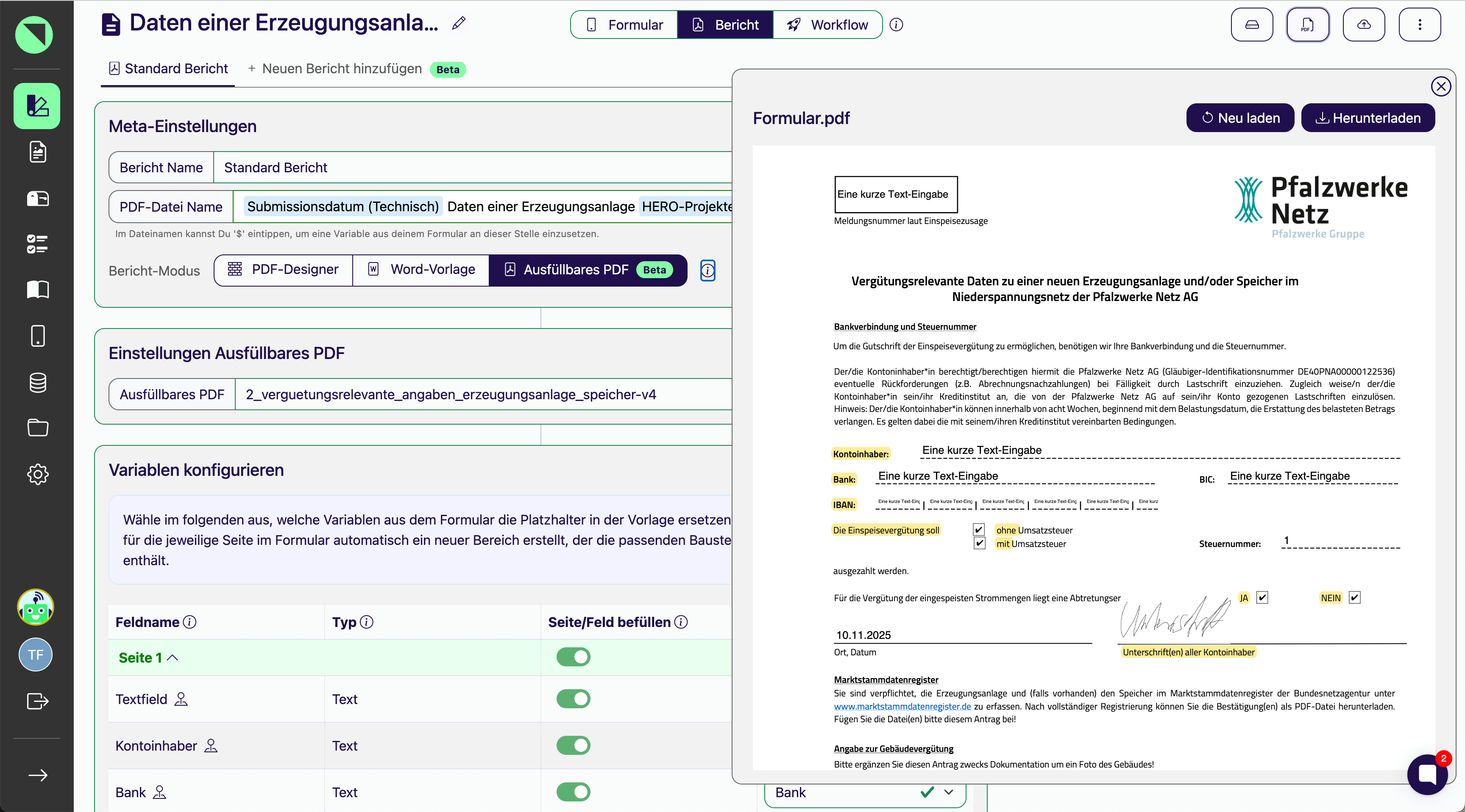 Mehrere Berichtvarianten je Formular (Expert-Plan)Bisher wurde zu jedem Datensatz nur ein PDF-Dokument erzeugt. Ab sofort kannst Du basierend auf einem aus der App abgeschickten Datensatz bis zu 10 verschiedene Berichte erzeugen. Für die automatisierte Weiterverarbeitung wird im Workflow-Designer einen eigener Workflow je Berichtvariante konfiguriert. So läßt sich zum Beispiel nach erfolgter Wartung ein ausführlicher Detailbericht in der Ablage speichern, während ein Kurzbericht per E-Mail an den Kunden versendet wird.