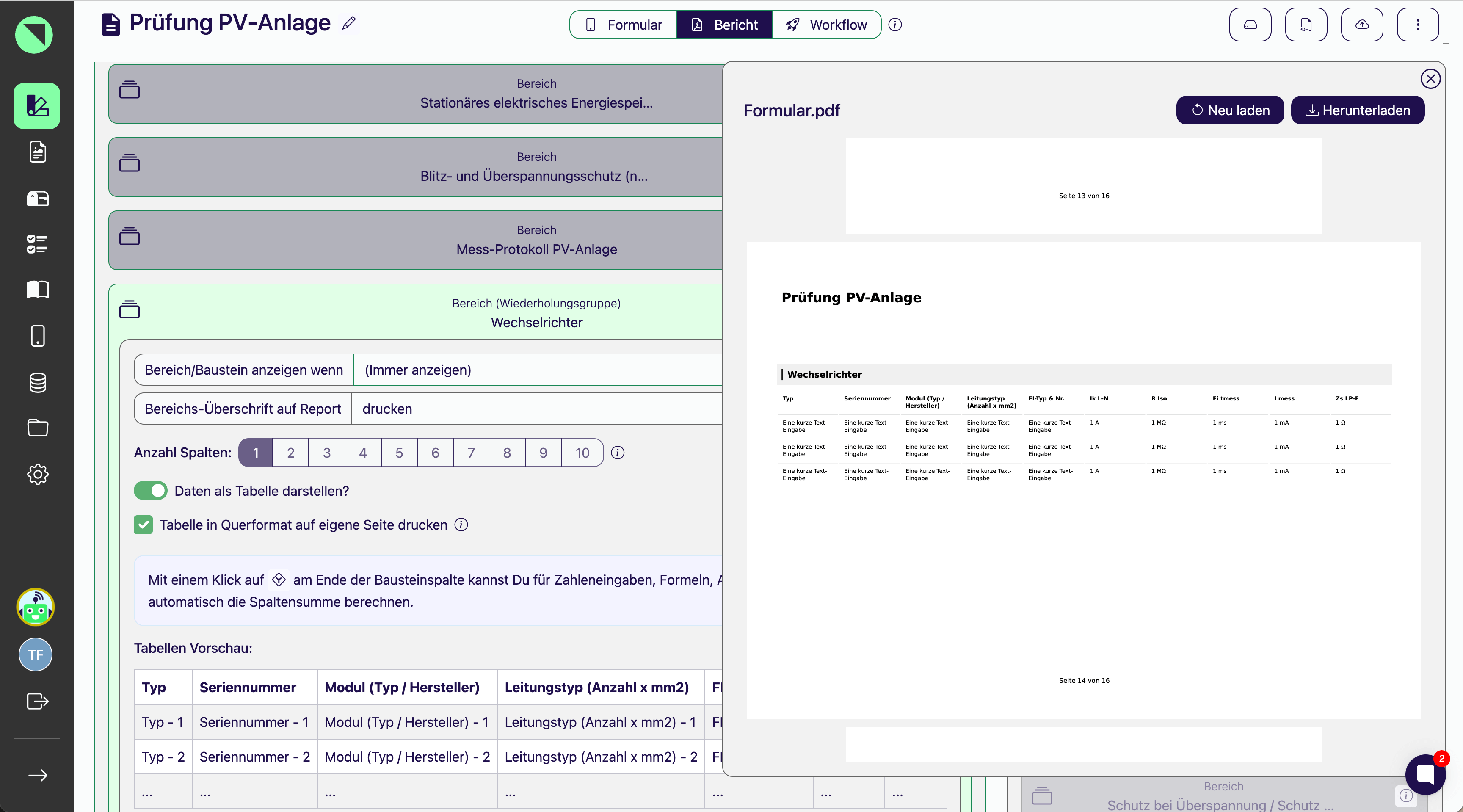Einzelne Tabellen im Querformat darstellen mit bis zu 20 SpaltenEine häufig genutzte Offpaper-Funktion ist die Tabellendarstellung der Einträge einer Wiederholungsgruppe im PDF-Bericht. Auf Grund des beschränkten Platzes eines Hochformat-Dokuments war die Tabellendarstellung bisher auf 10 Spalten begrenzt.