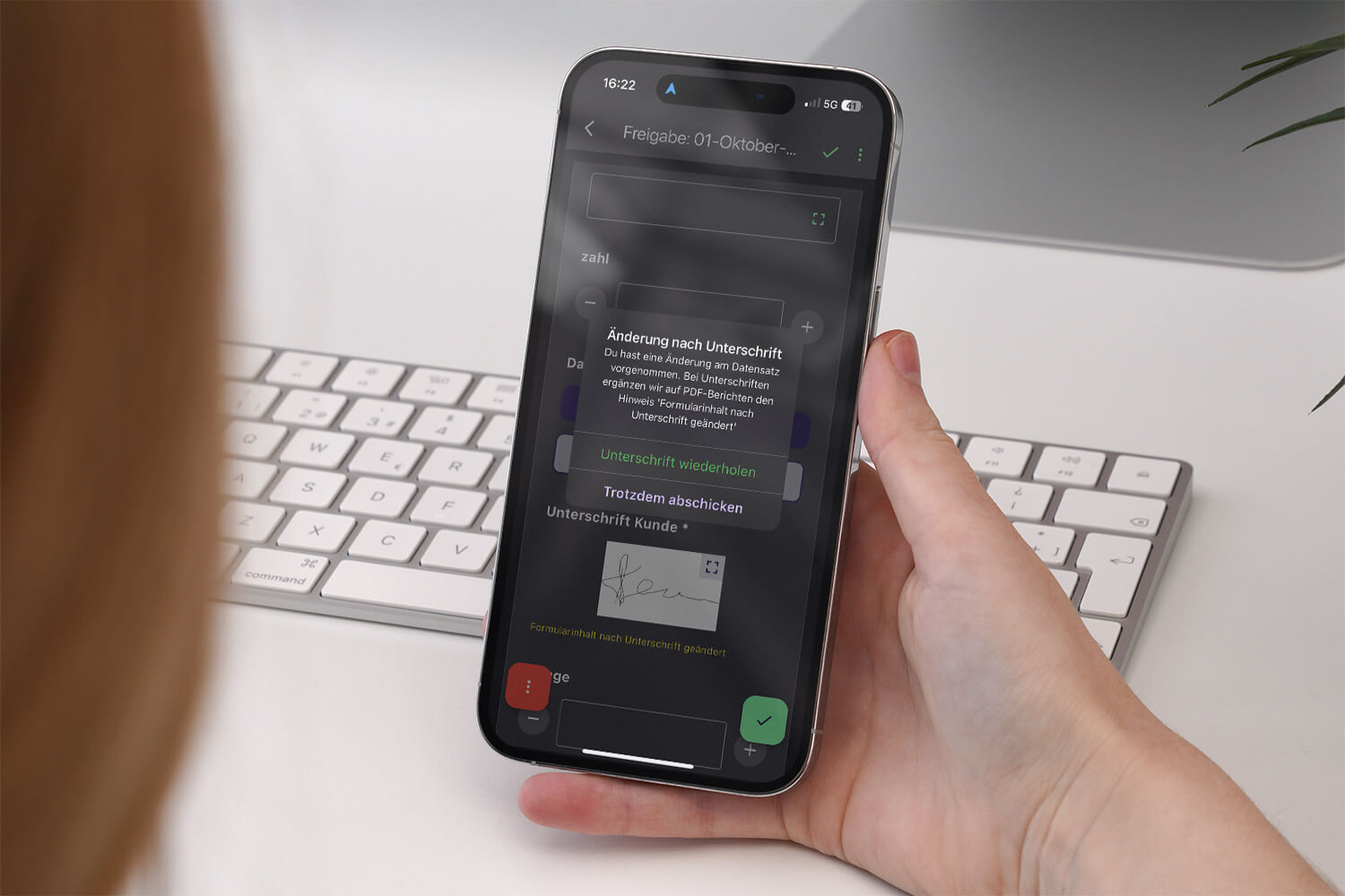 Wenn der Datensatz eine Unterschrift enthält, anschließend aber noch durch die Freigabeinstanz geändert wird, ergänzen wir den Bericht ab sofort mit dem Hinweis: “Formularinhalt nach Unterschrift geändert”. Damit bleibt transparent, welcher Datenstand unterschrieben wurde.