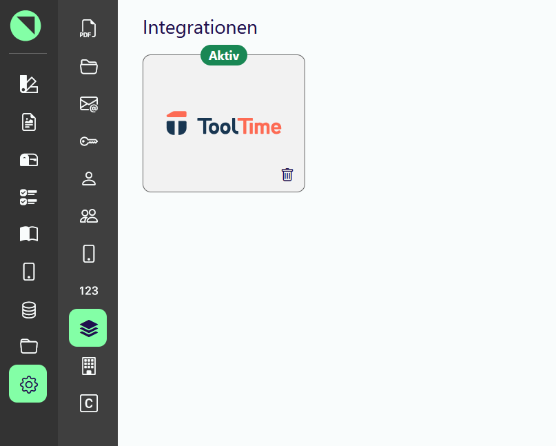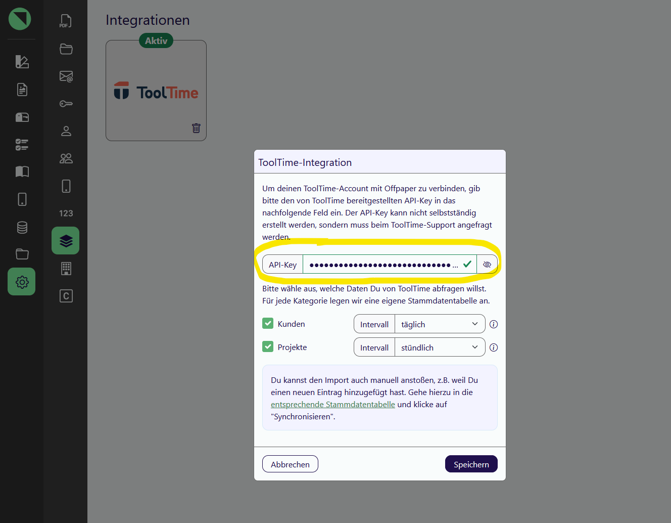 Gehe in die Offpaper Einstellungen und speichere den API-SchlüsselGeh in die Offpaper Einstellungen für die Integrationen. Klicke auf die Kachel ‘ToolTime’.