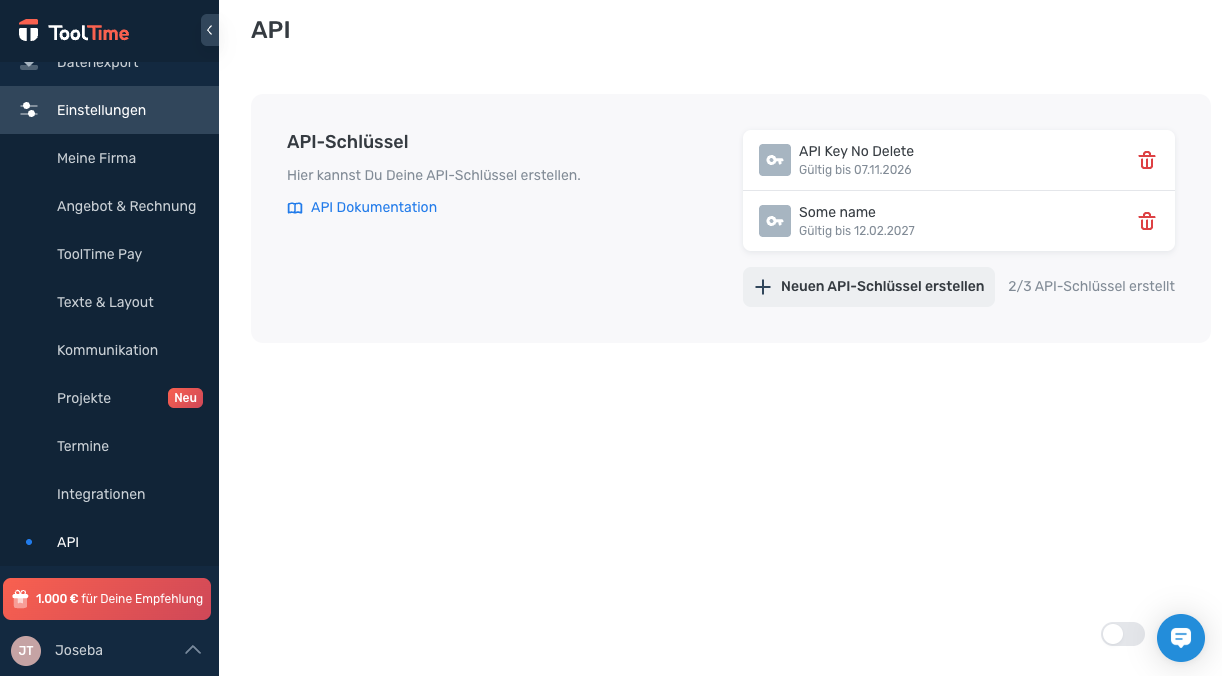 Gehe in die ToolTime-Einstellungen und erstelle einen neuen API-SchlüsselNachdem Du die Bestätigung für den API-Zugriff erhalten hast, navigiere in ToolTime zu „Einstellungen“ → „API“ (siehe folgendes Bild). Beachte: Du musst mit dem Eigentümerkonto angemeldet sein.